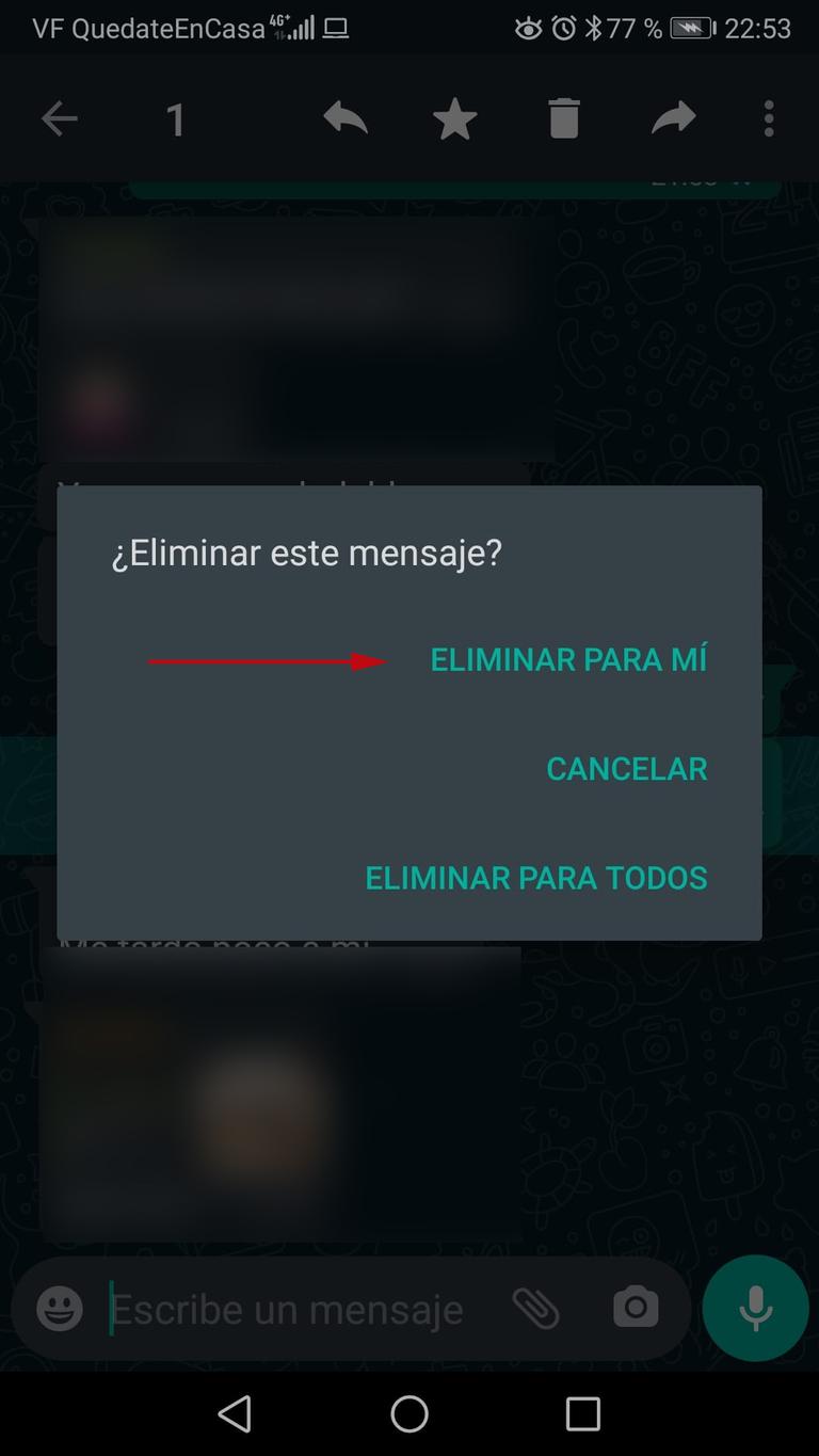 Al momento de eliminar un mensaje para mí, no aparecerá ningún mensaje sospechoso, simplemente desaparecerá. Nuestro contacto puede seguir viendo ese mensaje, pero en nuestra cuenta ya no figurará. Puede ser de gran ayuda si queremos conservar algo privado o eliminar un mensaje que no queremos que sea visto, pero que la otra persona pueda seguir viendo. Veamos los pasos a seguir para eliminar mensajes para mí en WhatsApp: